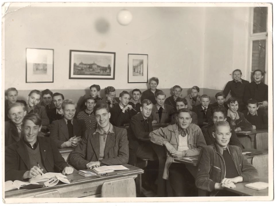 Ich kam nach einem Eignungstest sofort in die Quinta des Realgymnasiums. Die Schule war selbst noch im Aufbau, es fehlte an Lehrmitteln und Räumen, was gut ausgeglichen wurde durch erstklassige Pädagogen und auch einer gewissen Aufbruchsstimmung. Ich weiß nicht, ob das allgemein so war, aber meine aus allen sozialen Schichten zusammengewürfelte Klasse bildete bald eine verschworene Einheit, geführt von einer verständnisvollen, ledigen, älteren Studienrätin, die wir selten in Zorn geraten sahen, allerdings gaben wir ihr dazu auch kaum Anlass! Ein Wort von ihr im Englischunterricht ist mir stolz in Erinnerung geblieben: „He is the last, but not the least“ gebrauchte sie in Bezug auf mich als Erklärung des Ausdrucks. Wir kamen mit unseren Lehrern allgemein gut aus und hatten als Klasse daher einen guten Ruf, was nicht ausschloss, dass es manchmal, wie damals auch am Gymnasium üblich, Ohrfeigen setzte. […]