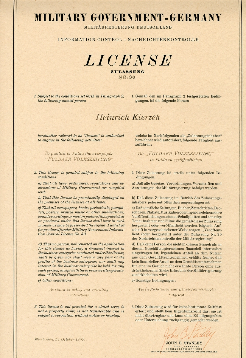 In Fulda erschien ab Oktober 1945 die Fuldaer Volkszeitung des Verlegers Heinrich Kierzek (1909-1975). Dieser erhielt die Lizenz zur Herausgabe der achten Zeitung in der amerikanischen Besatzungszone. Kierzek arbeitete als Redakteur bei der Tageszeitung "Echo der Gegenwart" in Aachen, bis zum Verbot 1935. Nach Kriegsende befreiten ihn die Amerikaner aus politischer Haft und setzten den Journalisten als Leiter der für die Entnazifizierung zuständigen „Special Branch“ in Fulda ein.