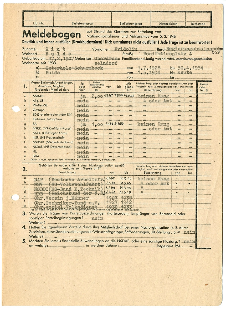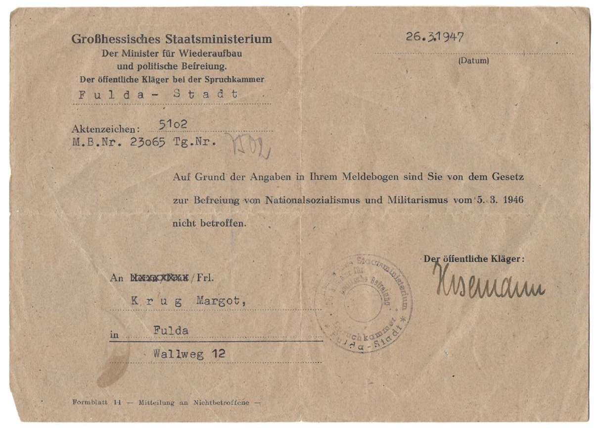 Ab dem Jahr 1946 entschieden in der amerikanischen Besatzungszone Spruchkammern, die mit deutschen Juristen und Laien besetzt waren, über die Schuld der ehemaligen NSDAP-Mitglieder. Am 23. April 1946 fand die feierliche Einsetzung der Spruchkammern für die Stadt und den Landkreis Fulda statt.