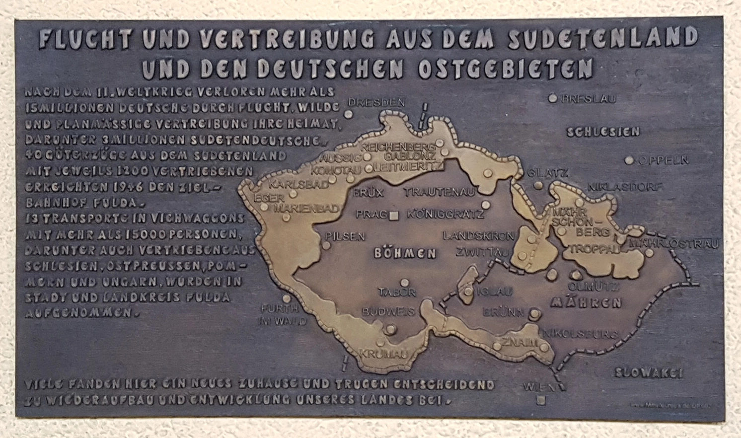 „In treuer Verbundenheit zur angestammten Heimat im Elbtal und böhmischen Mittelgebirge gedenken wir aller Toten aus Stadt und Kreis Leitmeritz, der Gefallenen beider Weltkriege, aller Opfer von Krieg und Verbrechen, der Opfer der Vertreibung von 1945-1946, sowie aller fern der Heimat Verstorbenen. August 1997, 23. Bundestreffen in der Patenstadt Fulda. Heimatkreisverband Leitmeritz E.V.“