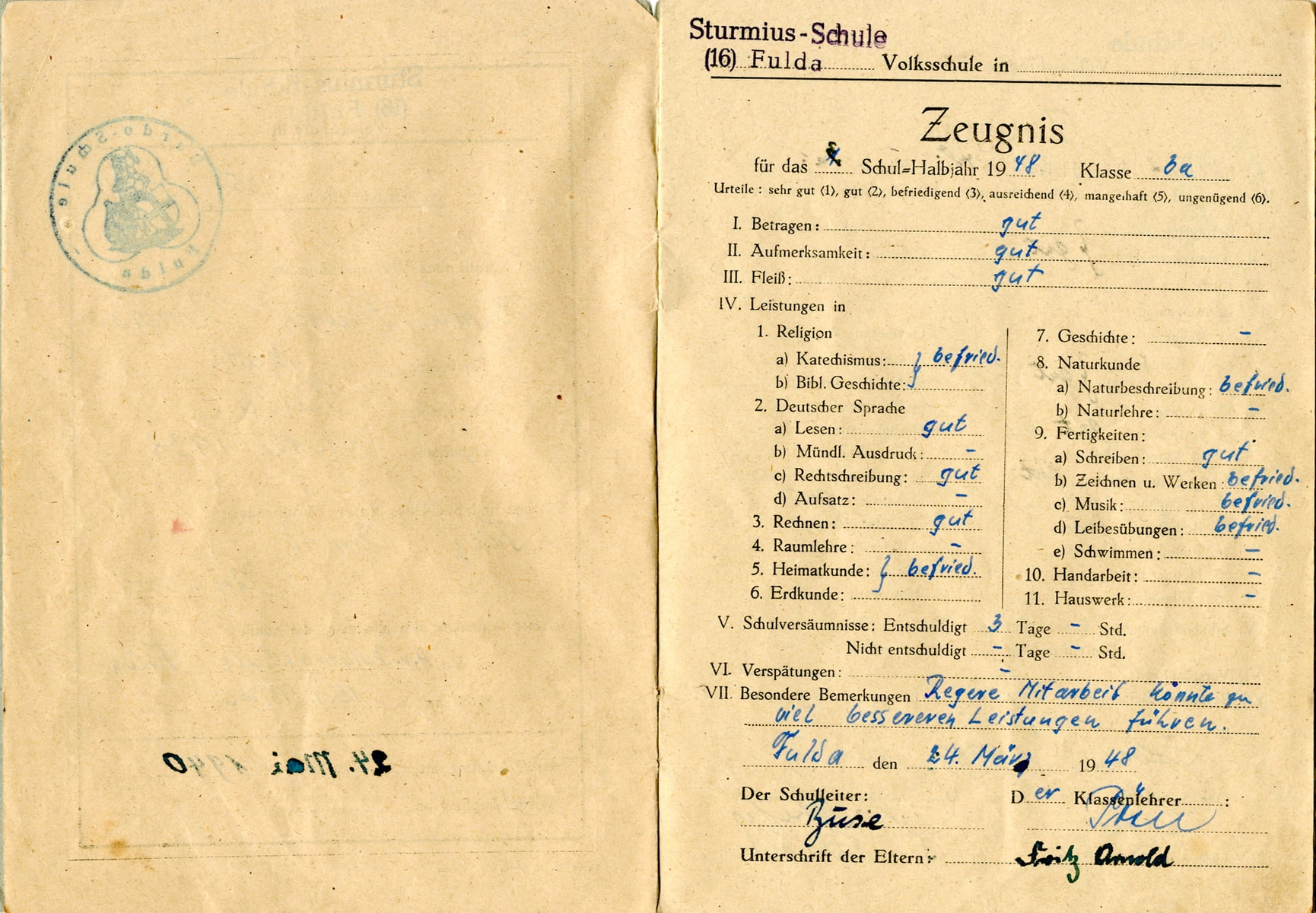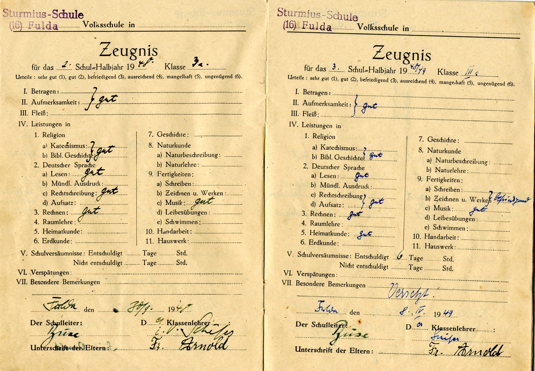 „Im dritten Schuljahr habe ich drei Halbjahreszeugnisse bekommen“. Da der Schuljahresbeginn allgemein von Herbst auf Frühling verlegt und das Schuljahr 1947/48 um ein Halbjahr verlängert wurde, erhielten die Schüler aller Klassen drei Halbjahreszeugnisse. Über das zusätzliche Halbjahr war Herr Arnold als Schüler nicht besonders glücklich: „Man wurde ein Stück zurückgeworfen und wir waren durch die späte Einschulung sowieso schon alte Schüler. Dieses Schuljahr war unendlich lang und nahm kein Ende“. In dieser Zeit wurden viele Ausflüge gemacht und die Klassen waren viel draußen unterwegs, es gab schließlich keinen Unterrichtsstoff mehr.
